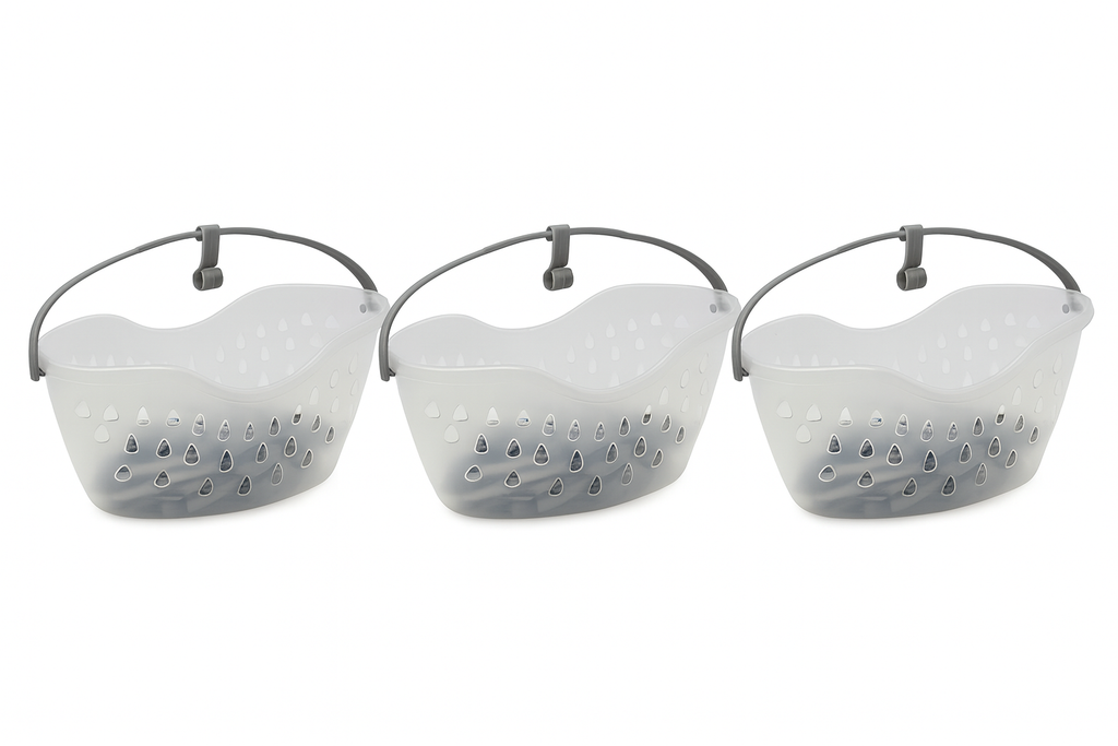 Este cesto multiusos está fabricado con material plástico semitransparente y flexible, e incluye un asa ergonómica que permite transportarlo o colgarlo fácilmente. El cuerpo del cesto cuenta con múltiples orificios de ventilación que mantienen el interior seco y aireado.