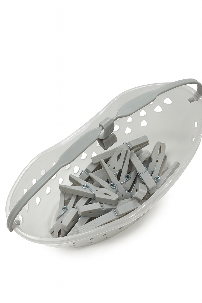 El set incluye 24 pinzas resistentes, ideales para colgar calcetines, ropa interior, paños pequeños y otras prendas ligeras.
