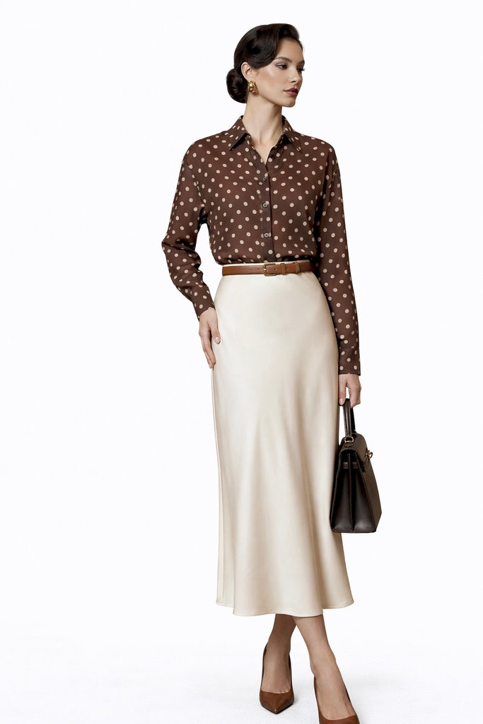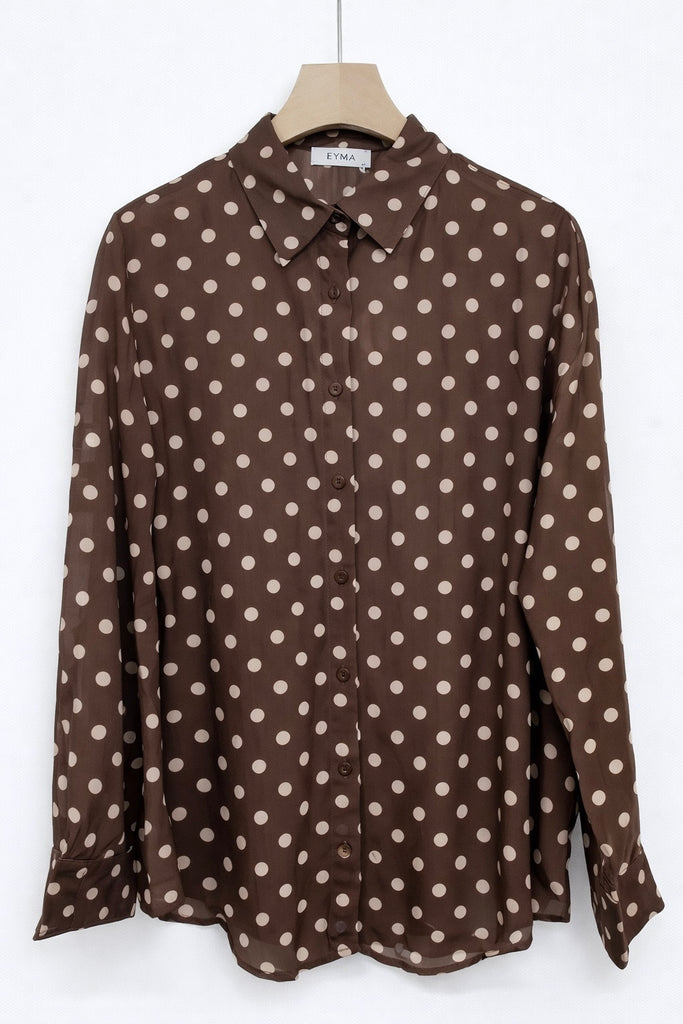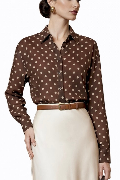 Camisa con estampado de lunares atemporal y cuello clásico. Tejido ligero y cómodo, de estilo elegante y femenino. Ideal para la oficina, looks formales o combinaciones diarias con falda o pantalón.