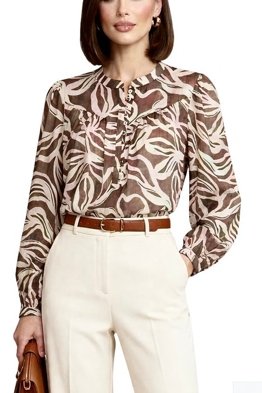 Gasa ligera con estampado moderno de hojas abstractas. Cuello redondo con botones y corte cómodo. Elegante y versátil, ideal para oficina y uso diario.
