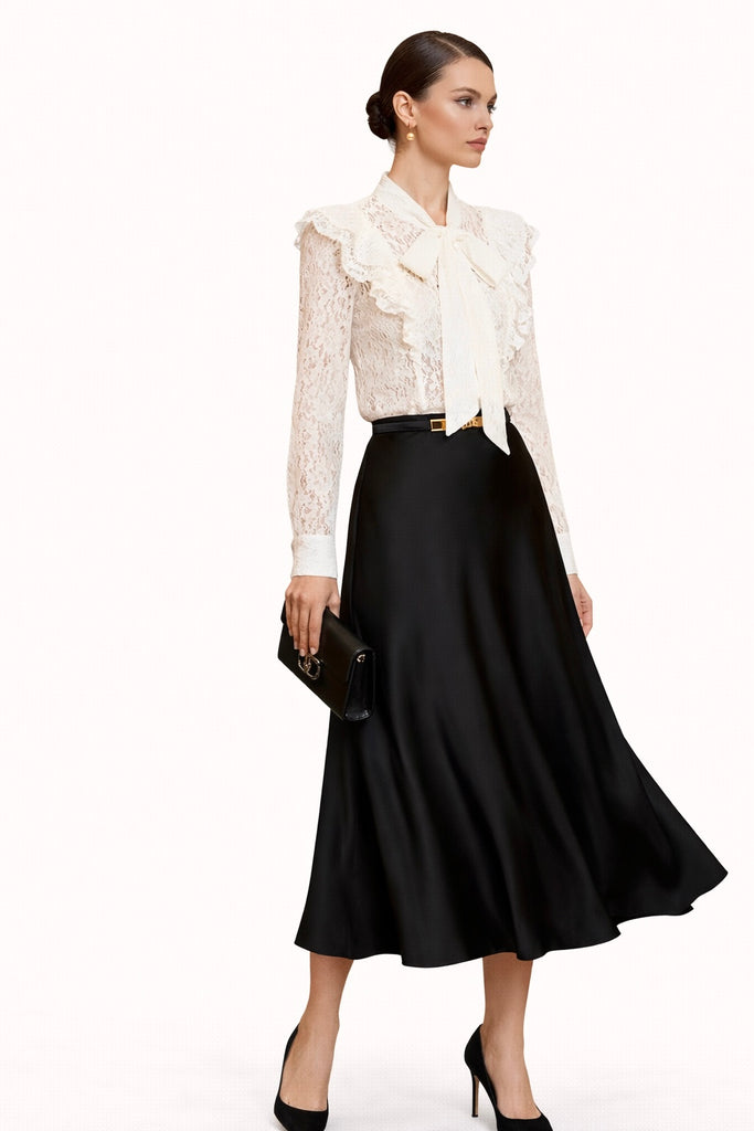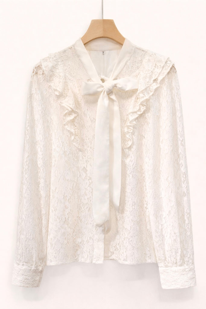Blusa de encaje delicado con detalles de volantes y lazo en el cuello. Diseño elegante y femenino, ideal para looks formales, de oficina o ocasiones especiales.