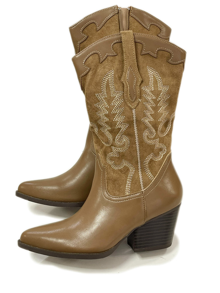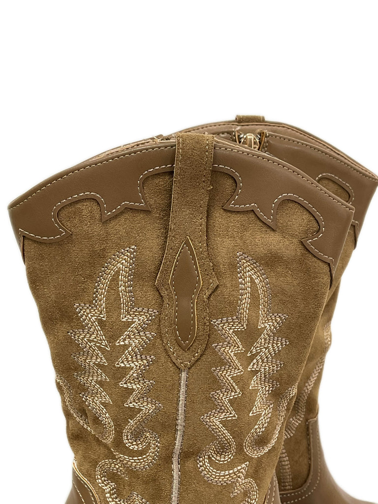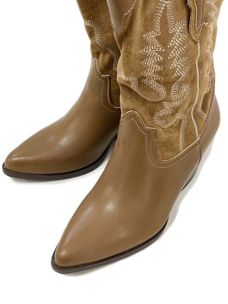 Estas botas de mujer combinan cuero PU de alta calidad con una parte superior tipo gamuza, creando un auténtico estilo vaquero moderno. Los detalles bordados aportan un toque artesanal, mientras que el cierre lateral dorado permite un calce rápido y cómodo. El tacón medio ancho ofrece estabilidad, y la punta afilada estiliza la figura, convirtiéndolas en un imprescindible de la temporada otoño-invierno.