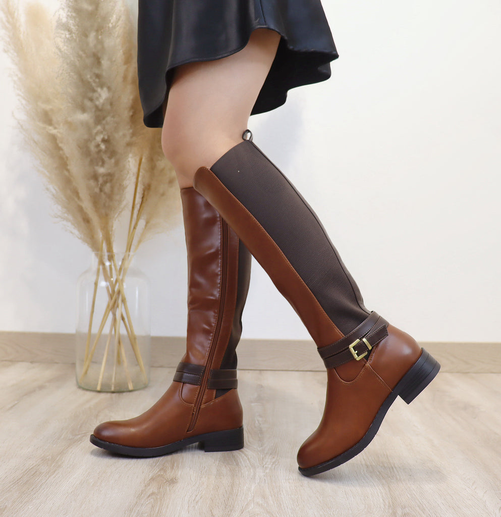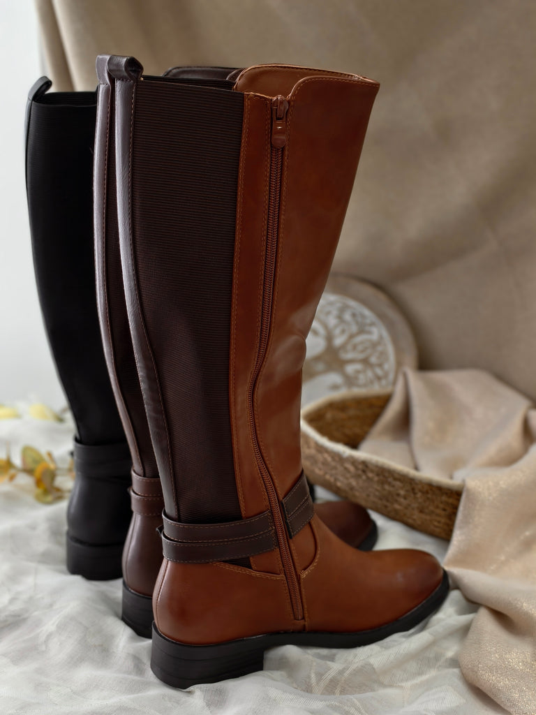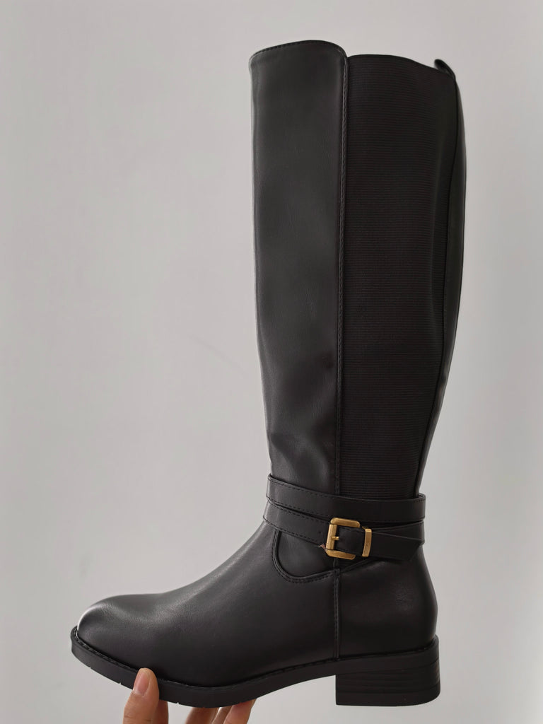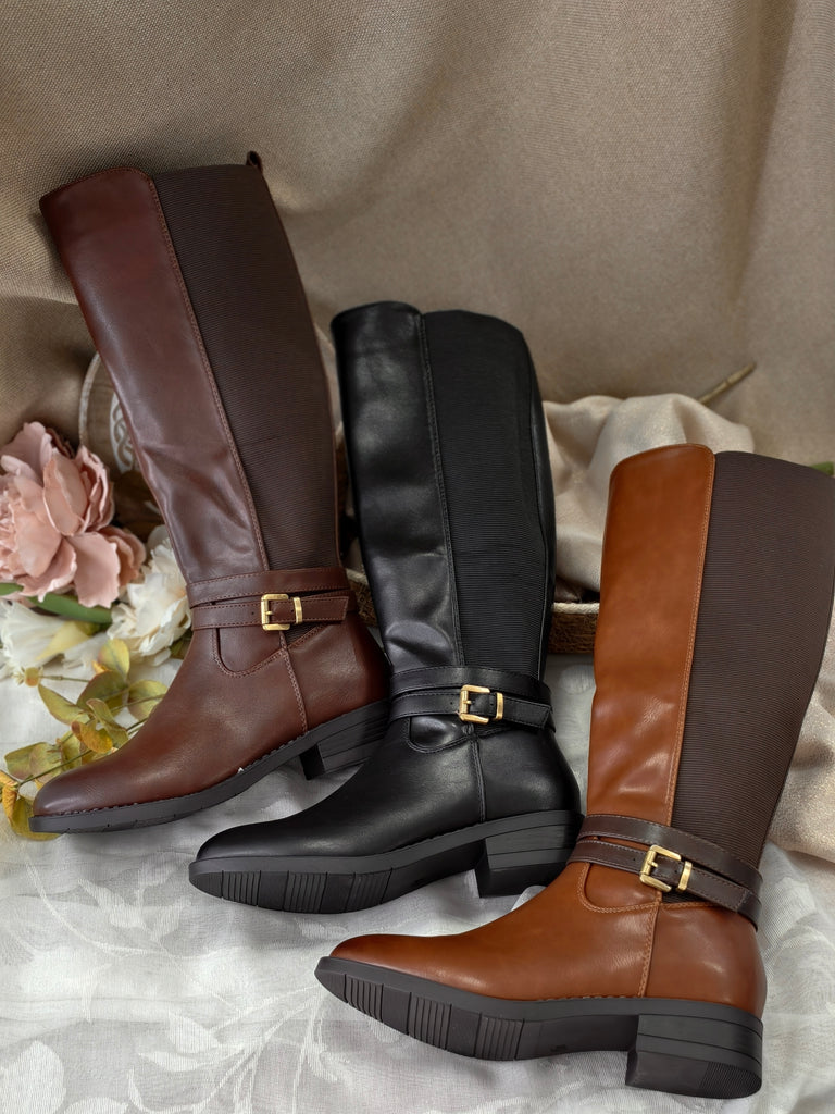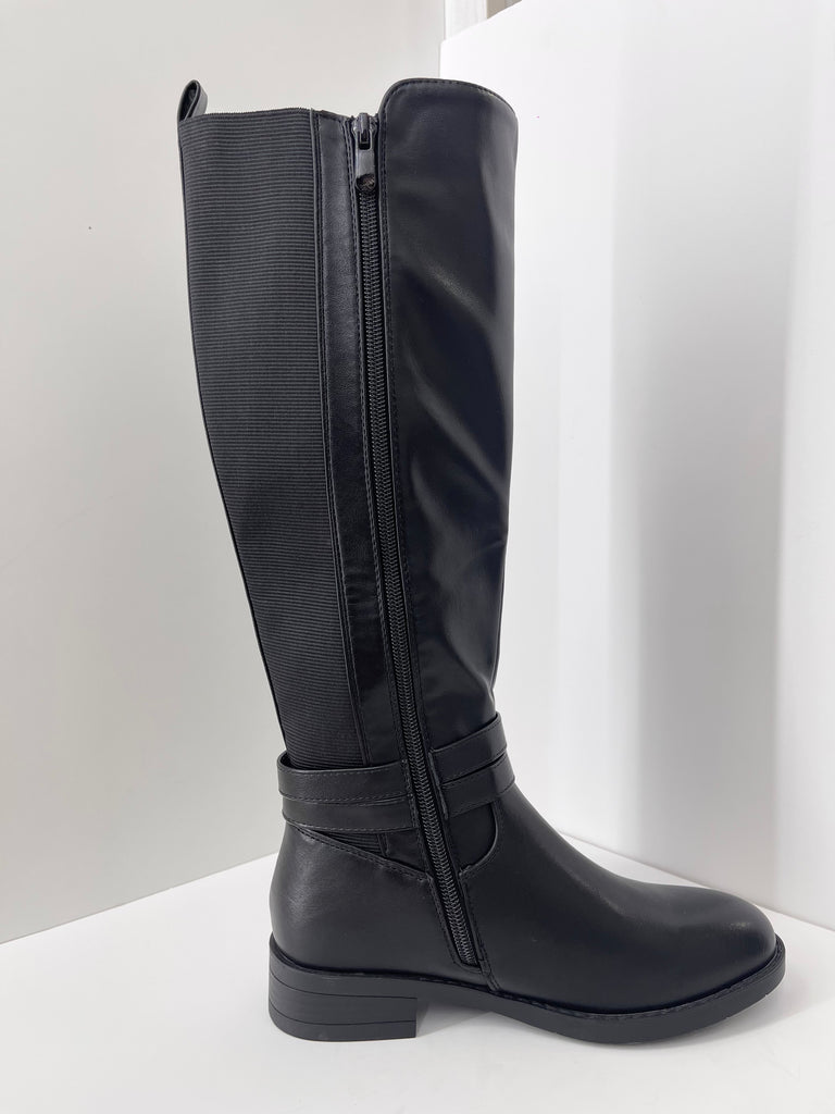 Bota alta de mujer confeccionada en material de polipiel, tacon ancho y puentera con forma redonda. Caña alta con elastico en ambos lados y cierre mediante cremallera.