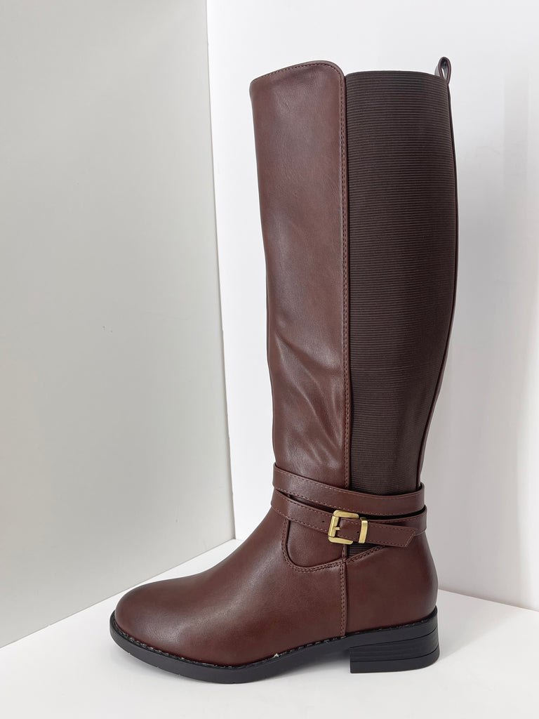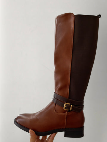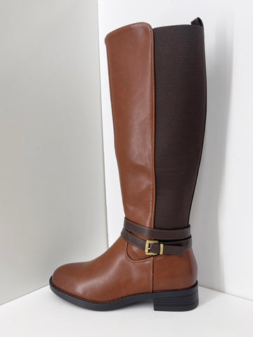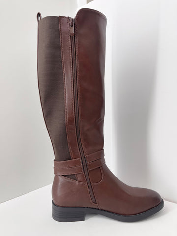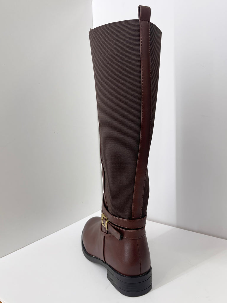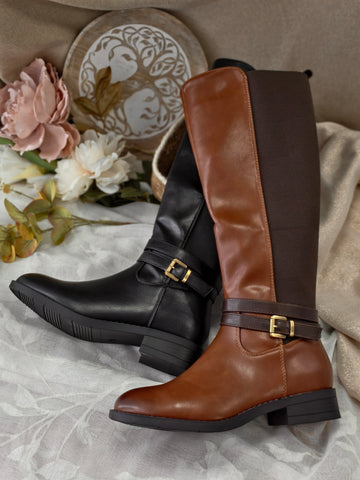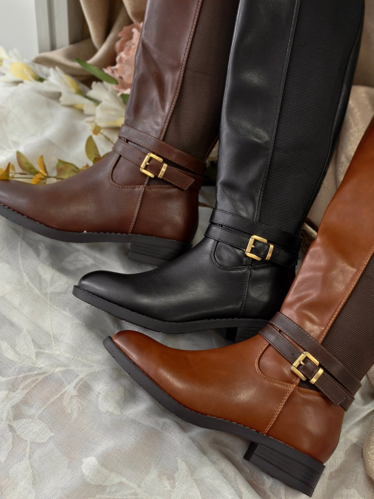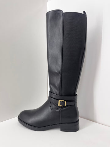 Bota alta de mujer confeccionada en material de polipiel, tacon ancho y puentera con forma redonda. Caña alta con elastico en ambos lados y cierre mediante cremallera.