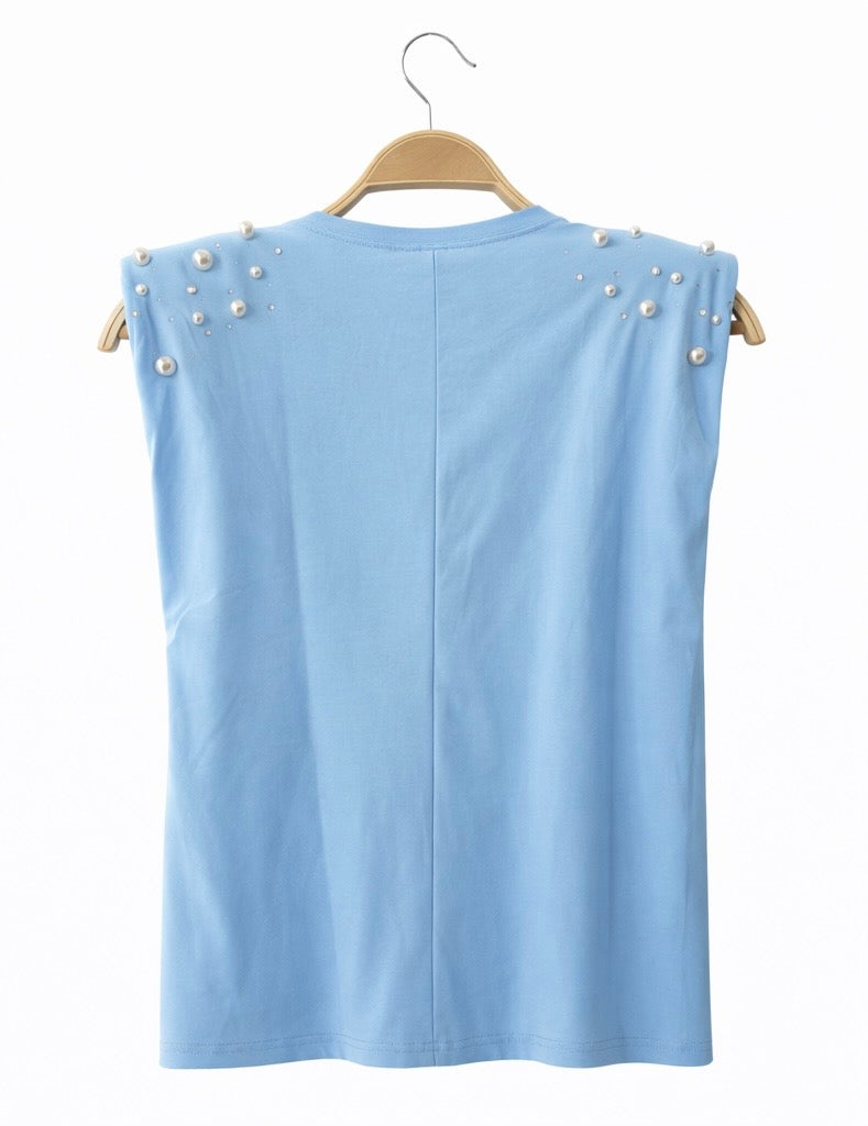 Decoración de perlas en los hombros que aporta un toque elegante.