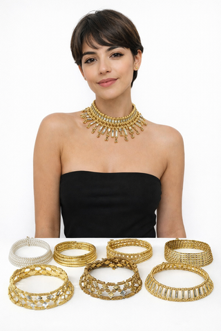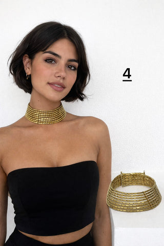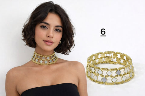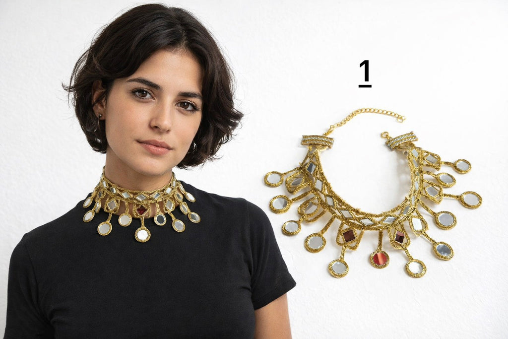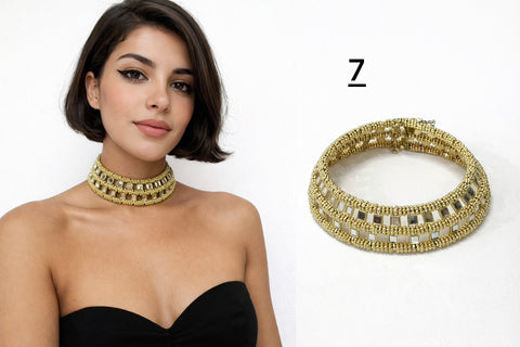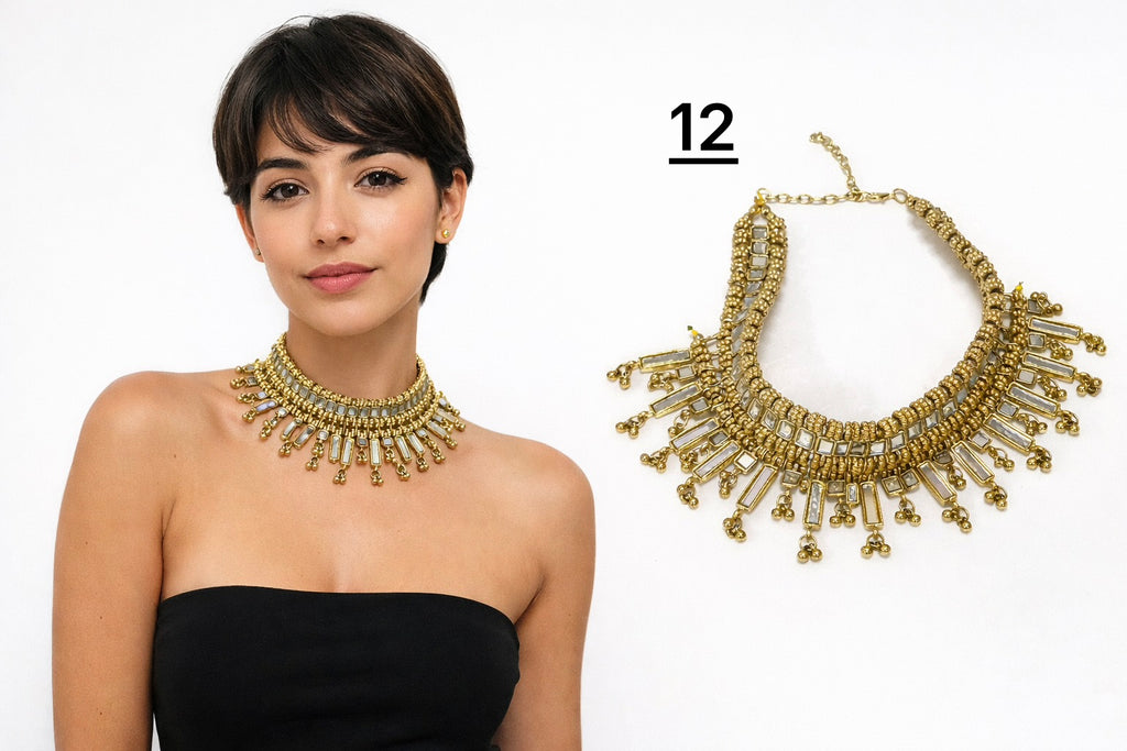Este collar tipo choker de estilo vintage presenta un delicado diseño geométrico calado, decorado con cristales multicolores y pequeños flecos dorados. Su inspiración bohemia y oriental lo convierte en una pieza llamativa y sofisticada para realzar cualquier look.