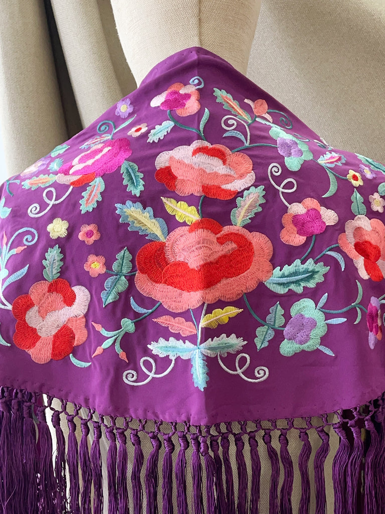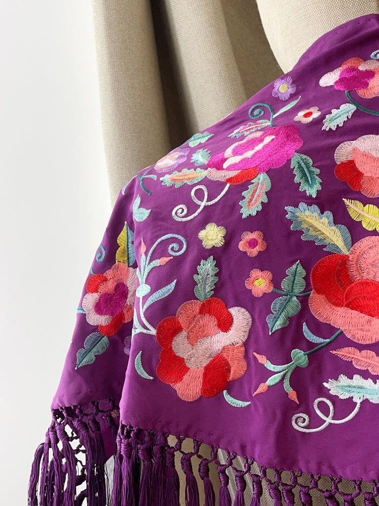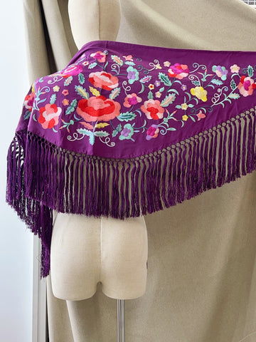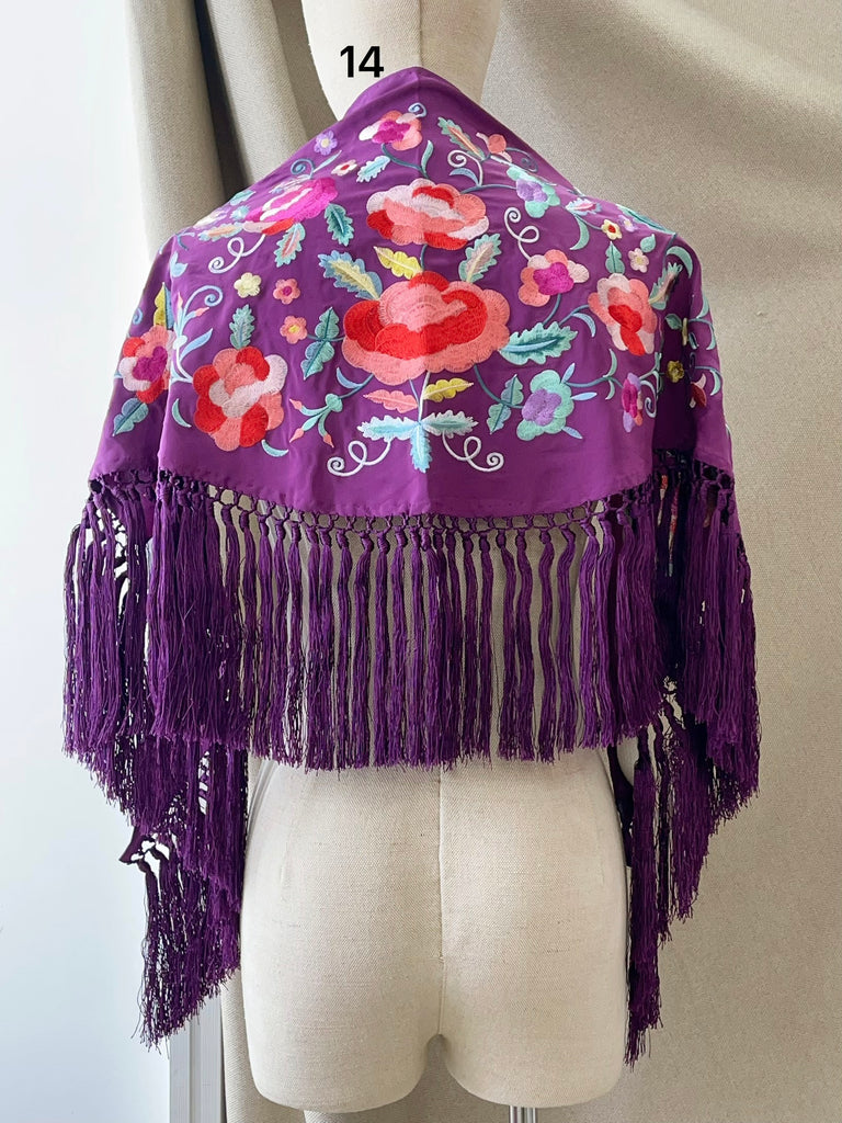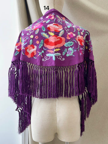 M01-2 Mantón bordado lila con flores y aves con flecos MANT3999