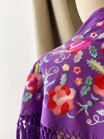 M01-2 Mantón bordado lila con flores y aves con flecos MANT3999