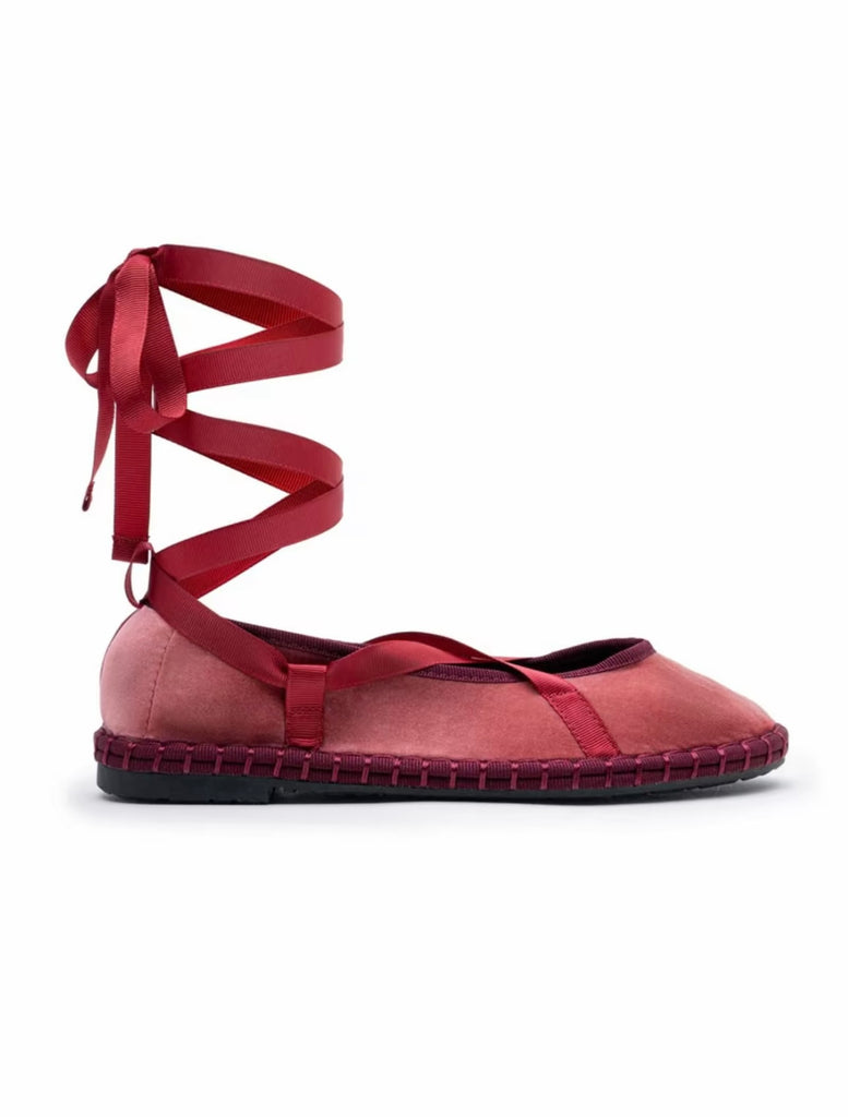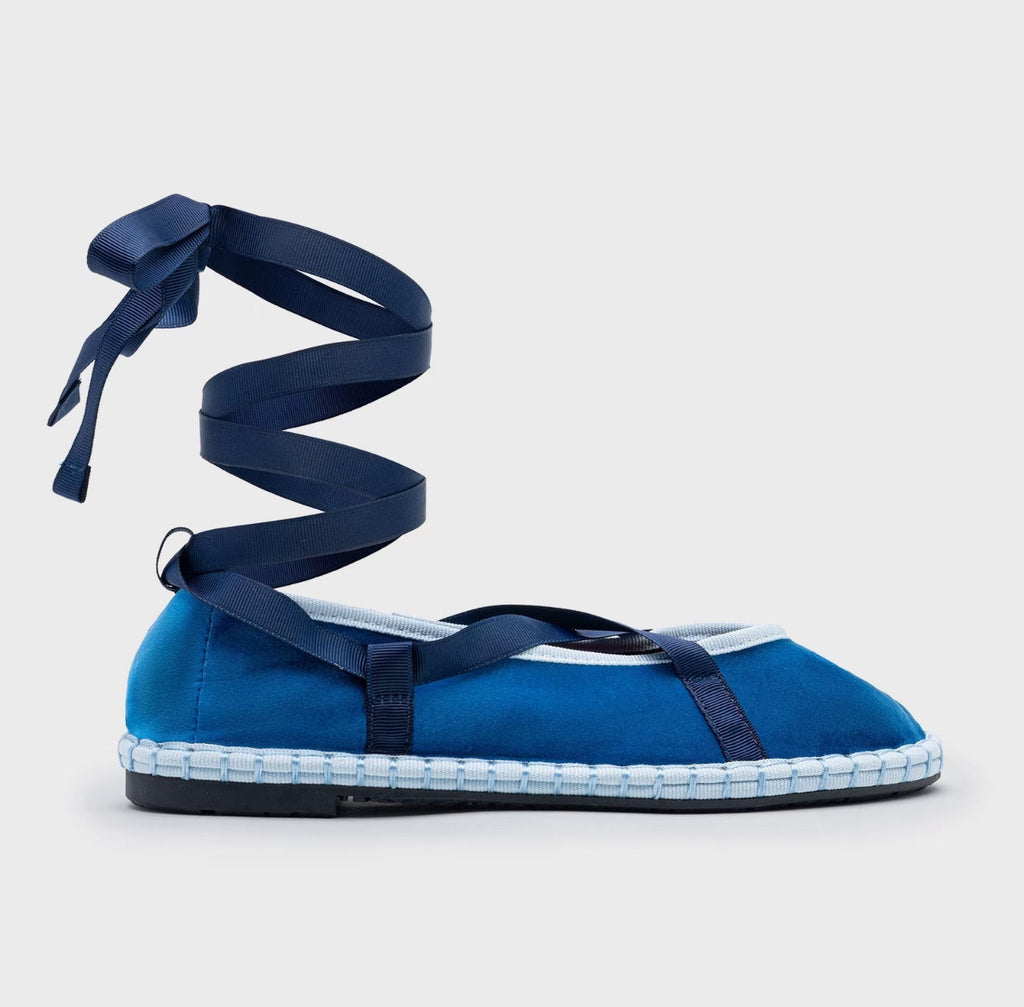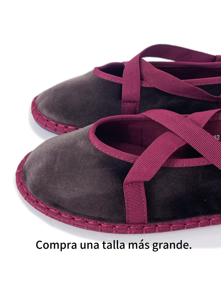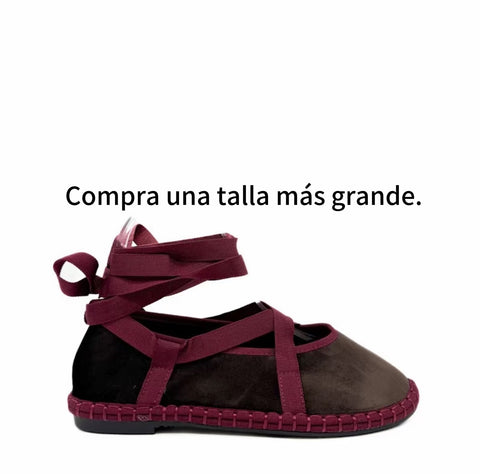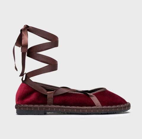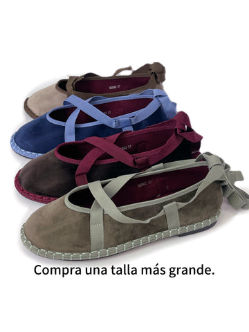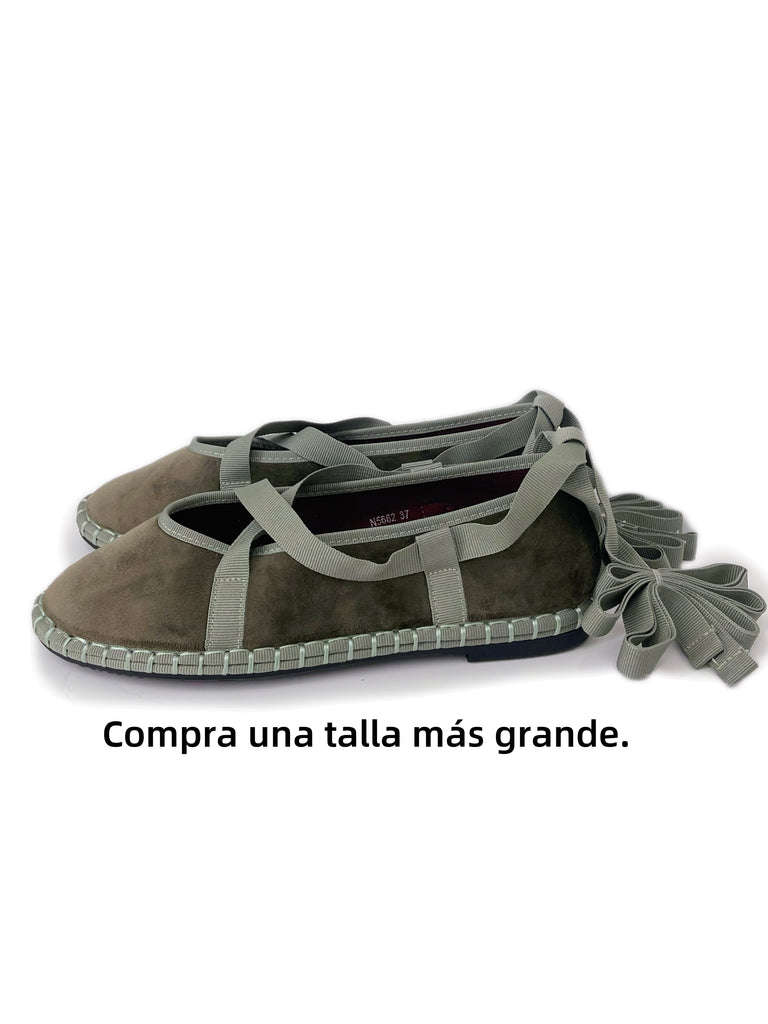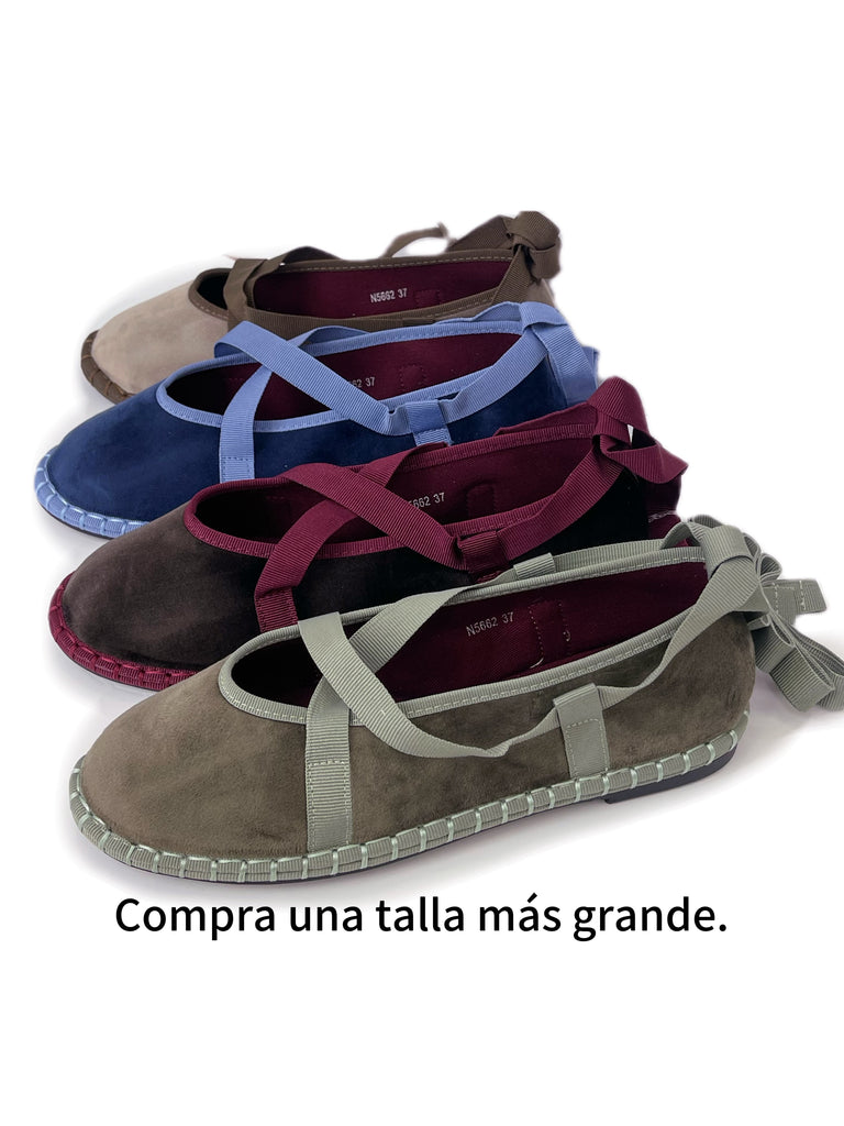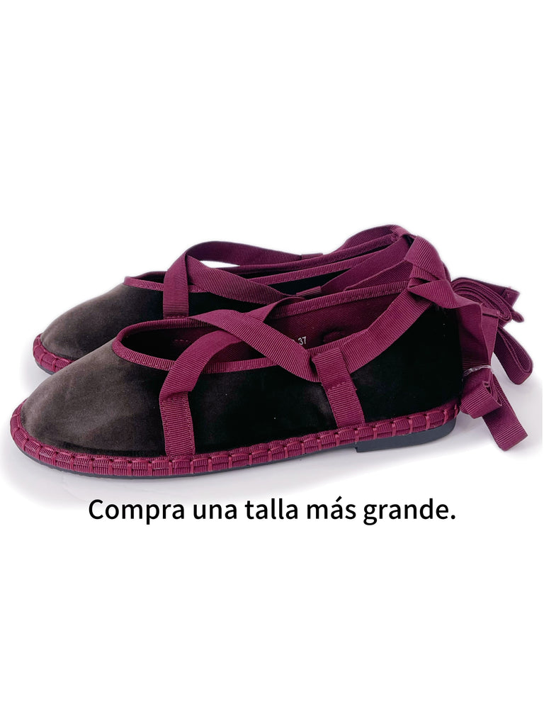Zapato plano tipo bailarina. Tejido terciopelo. Acabado en punta redonda. Cierre de cordones. Suela plana. Suela de contacto antideslizante. Altura piso.1.0cm