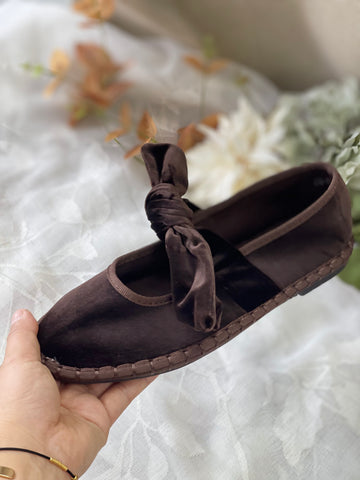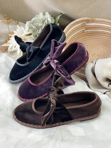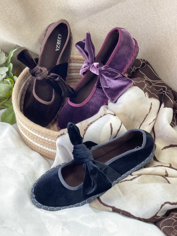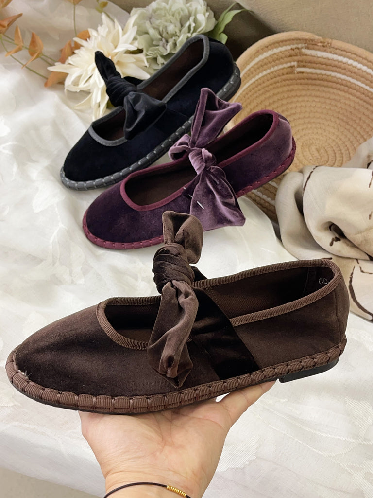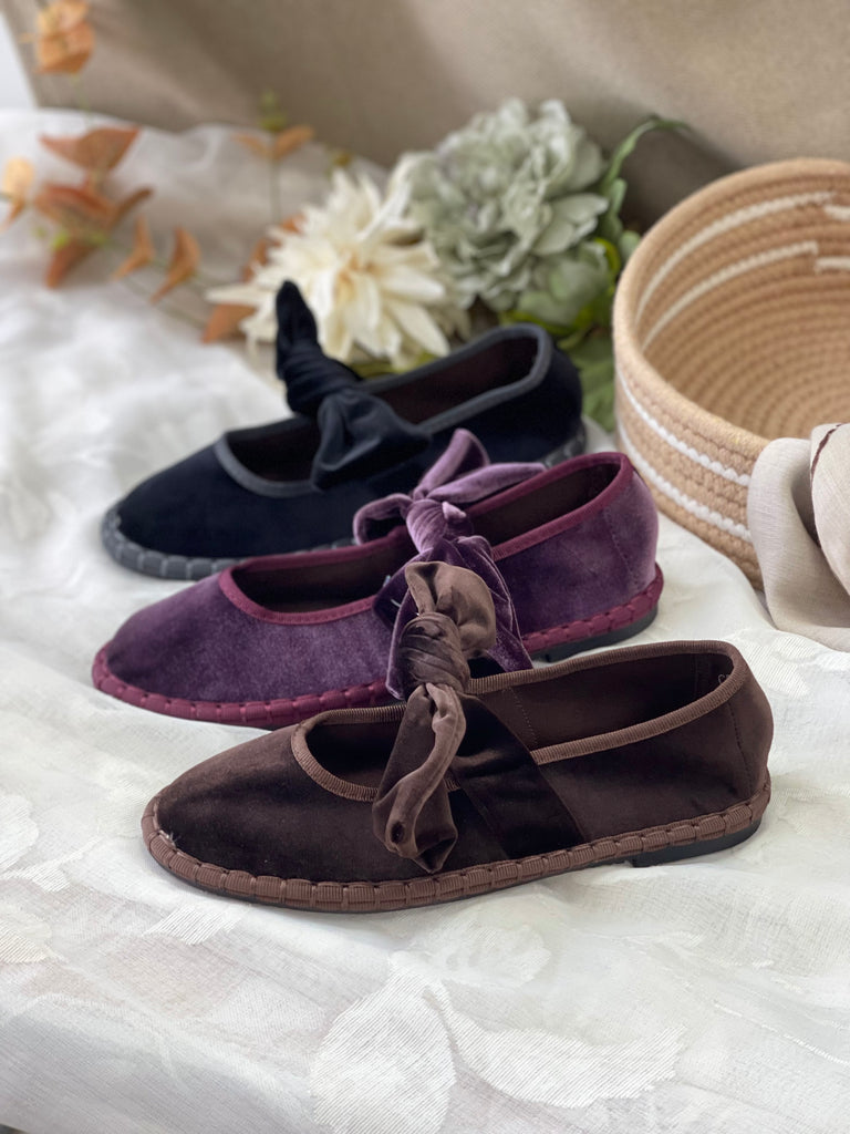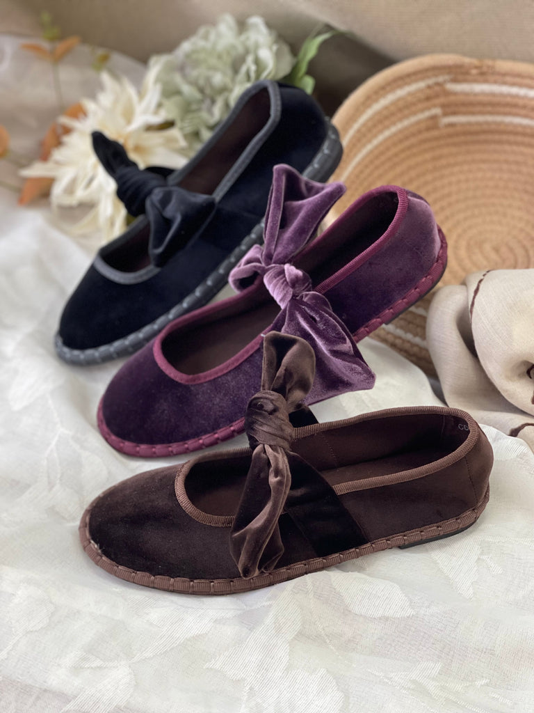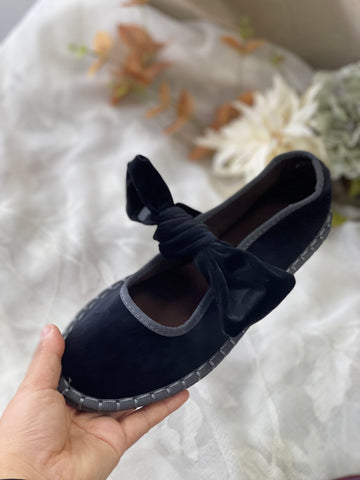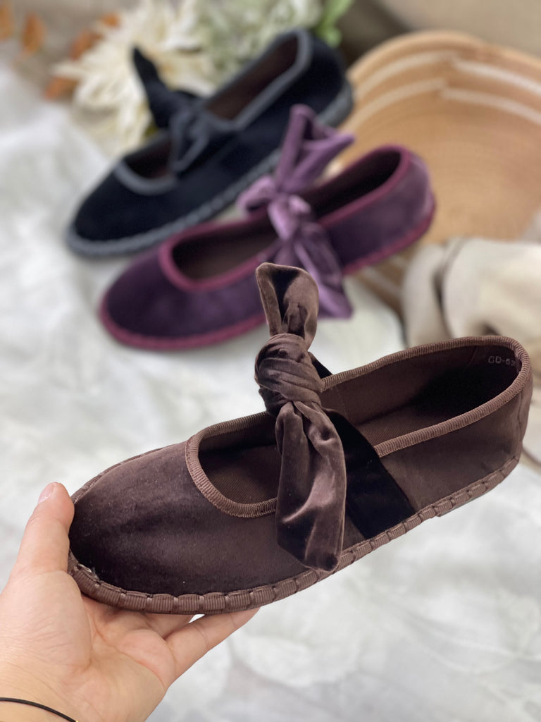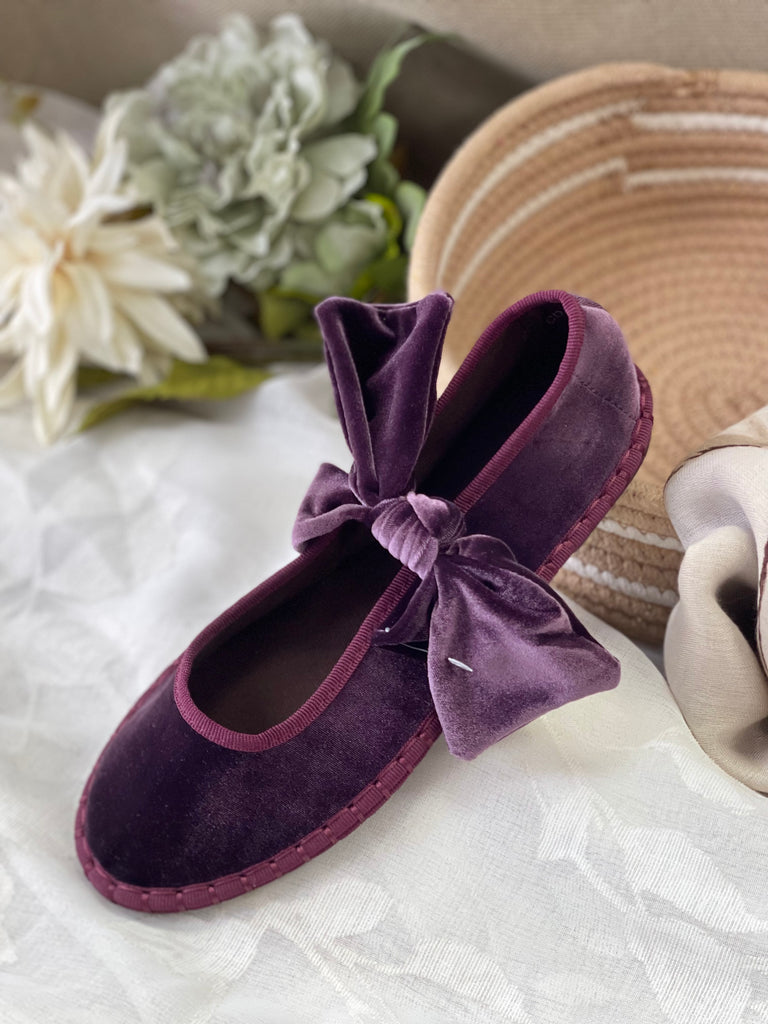 Zapato plano tipo bailarina. Tejido terciopelo. Acabado en punta redonda. Detalle lazo. Se recomienda pedir una talla más.