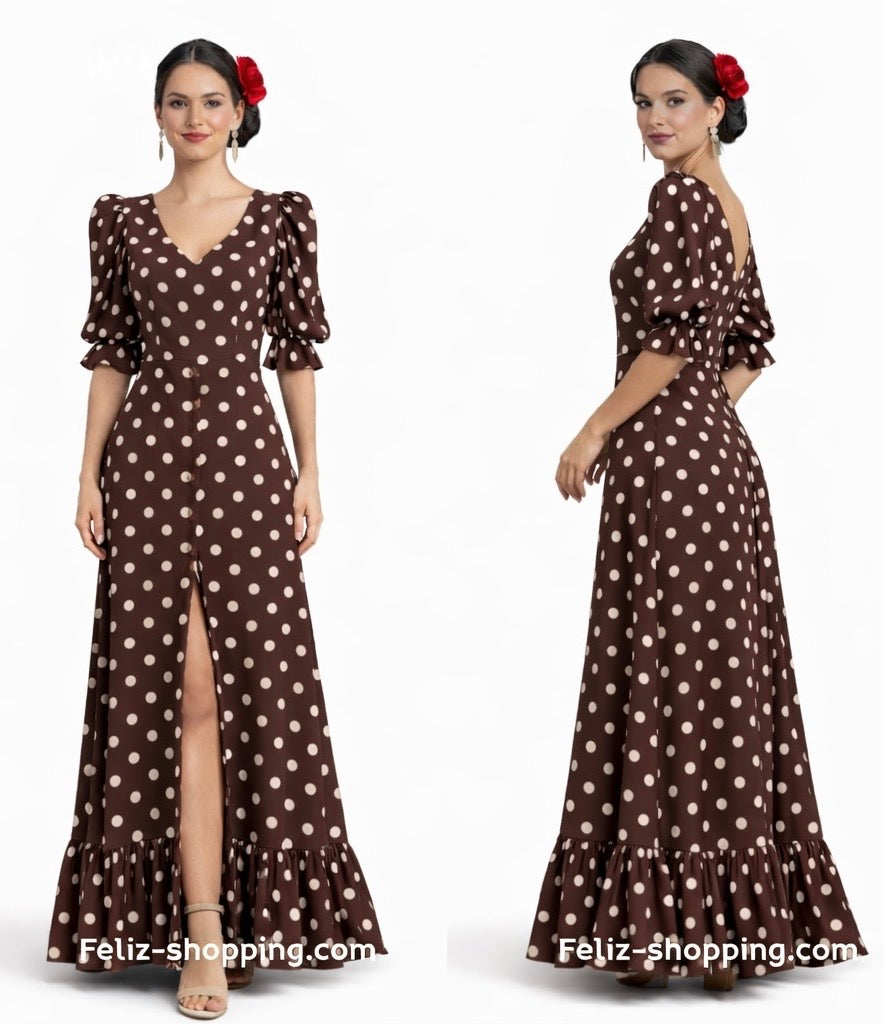 Elegante vestido largo de estilo flamenco con estampado de lunares. Diseño con escote en V y corte entallado que realza la silueta femenina. El volante en el bajo y la abertura frontal aportan un toque muy flamenco. Perfecto para Feria, Romería, baile flamenco o celebraciones. Disponible en varios colores.