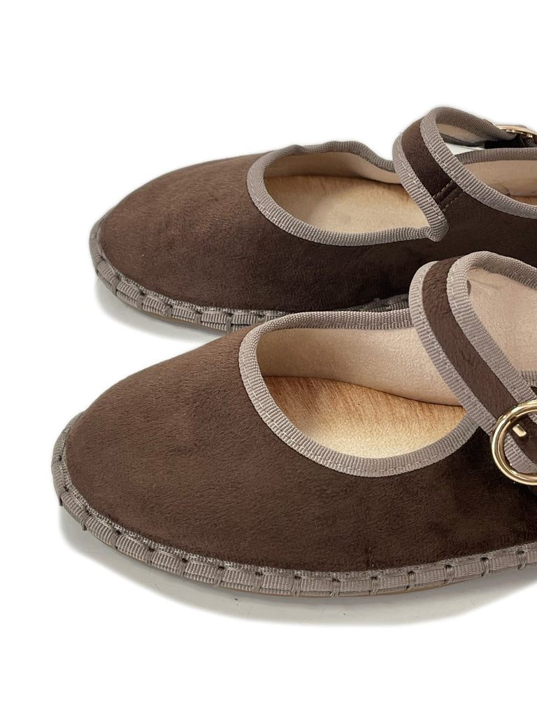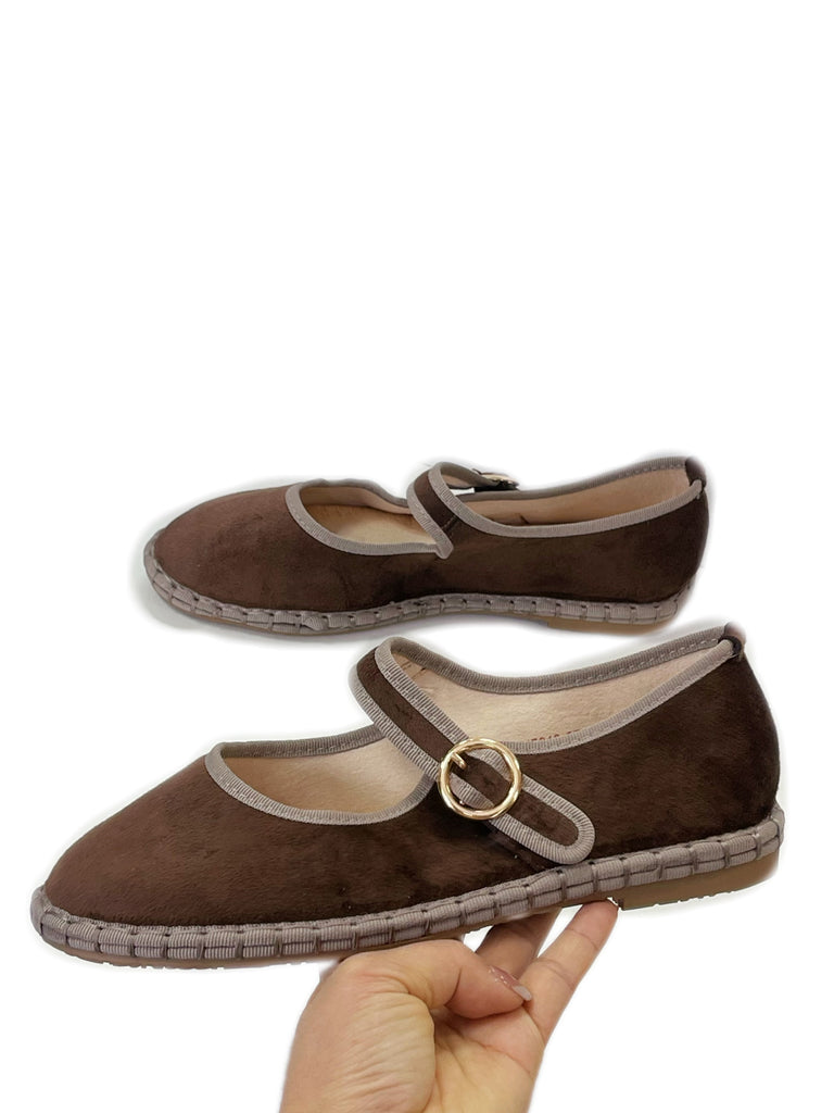 Estos zapatos Mary Jane en color marrón están fabricados con un material afelpado suave y cómodo al tacto. Su diseño de punta redonda combinado con una correa ajustable y una hebilla dorada aporta un estilo clásico y vintage. El borde texturizado y la suela con detalle tejido añaden un toque distintivo. La suela ligera y flexible los hace ideales para caminar durante todo el día, perfectos para trabajo, salidas casuales o un estilo artístico y femenino.