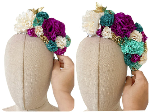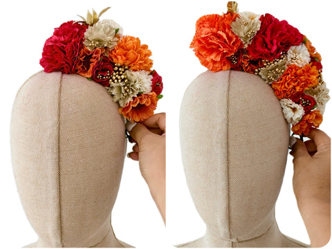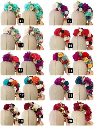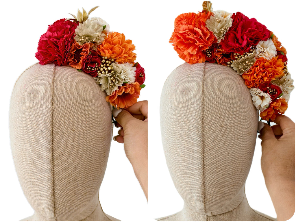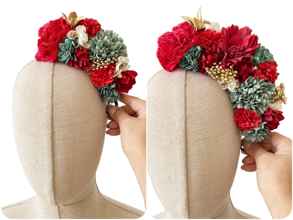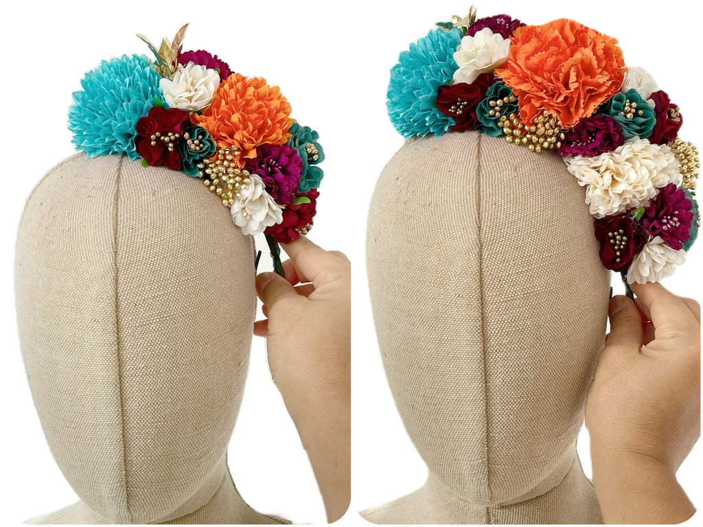 Vive la pasión andaluza con esta corona flamenca artesanal. Hecha con flores de tela de alta calidad, es perfecta para festivales o actuaciones llenas de color y alegría.