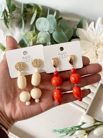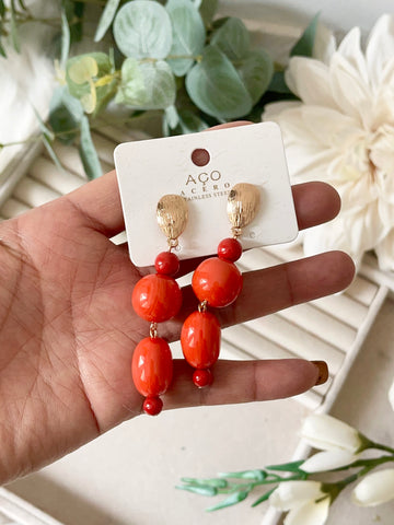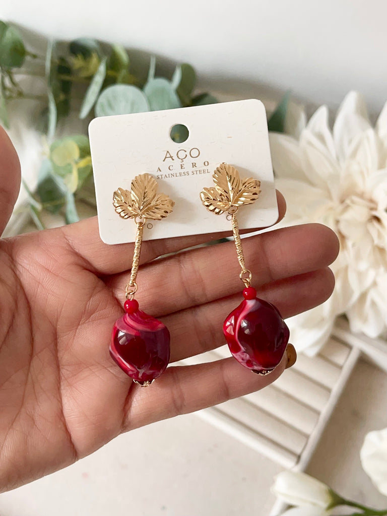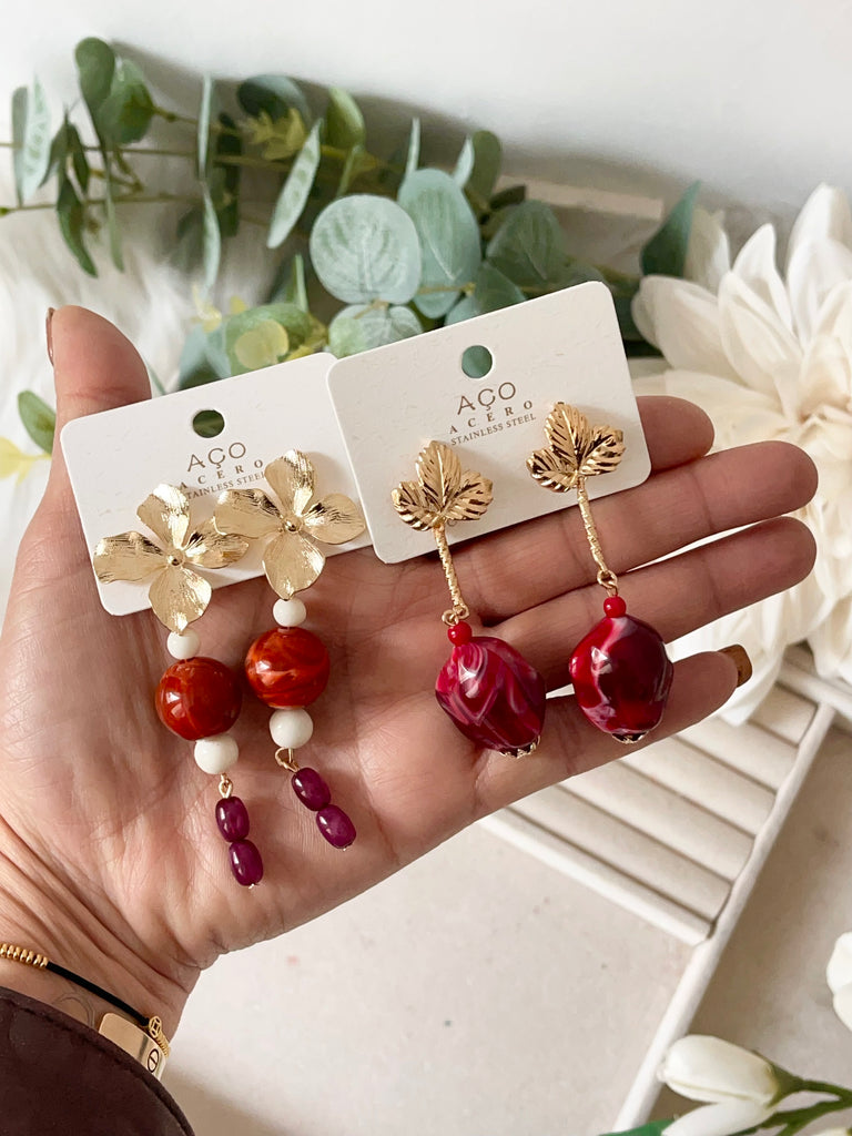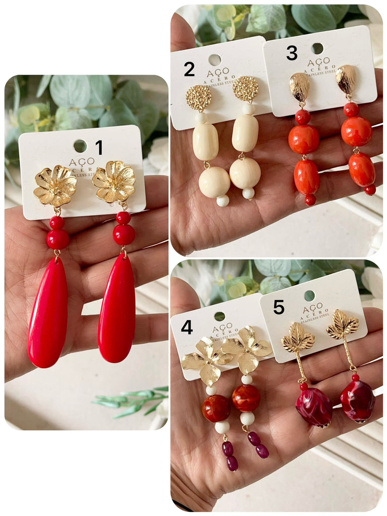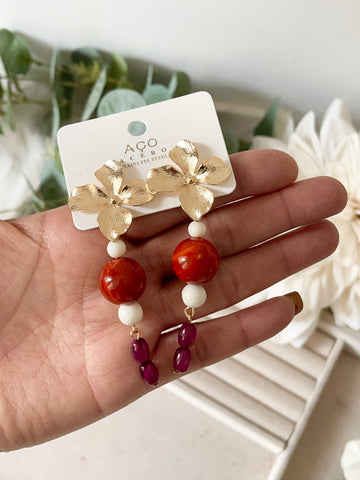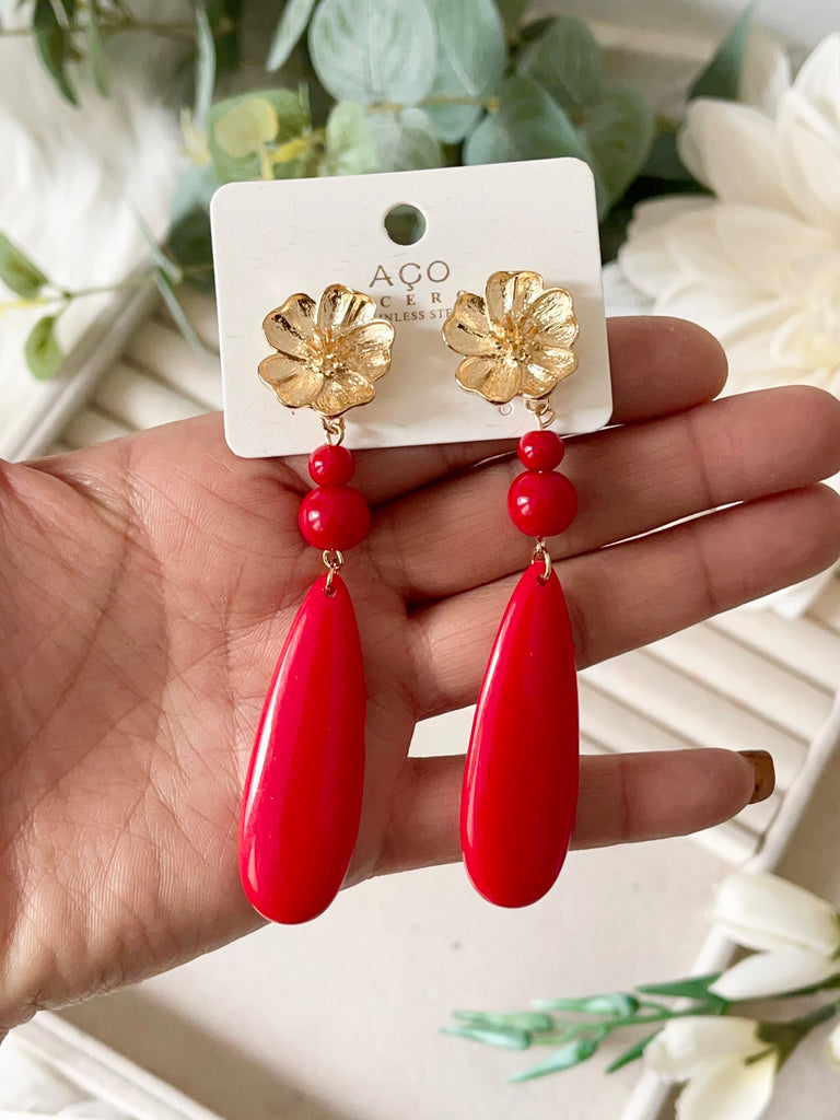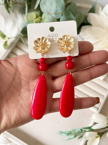 Aretes colgantes vintage con flor dorada y cuentas rojas pen899
